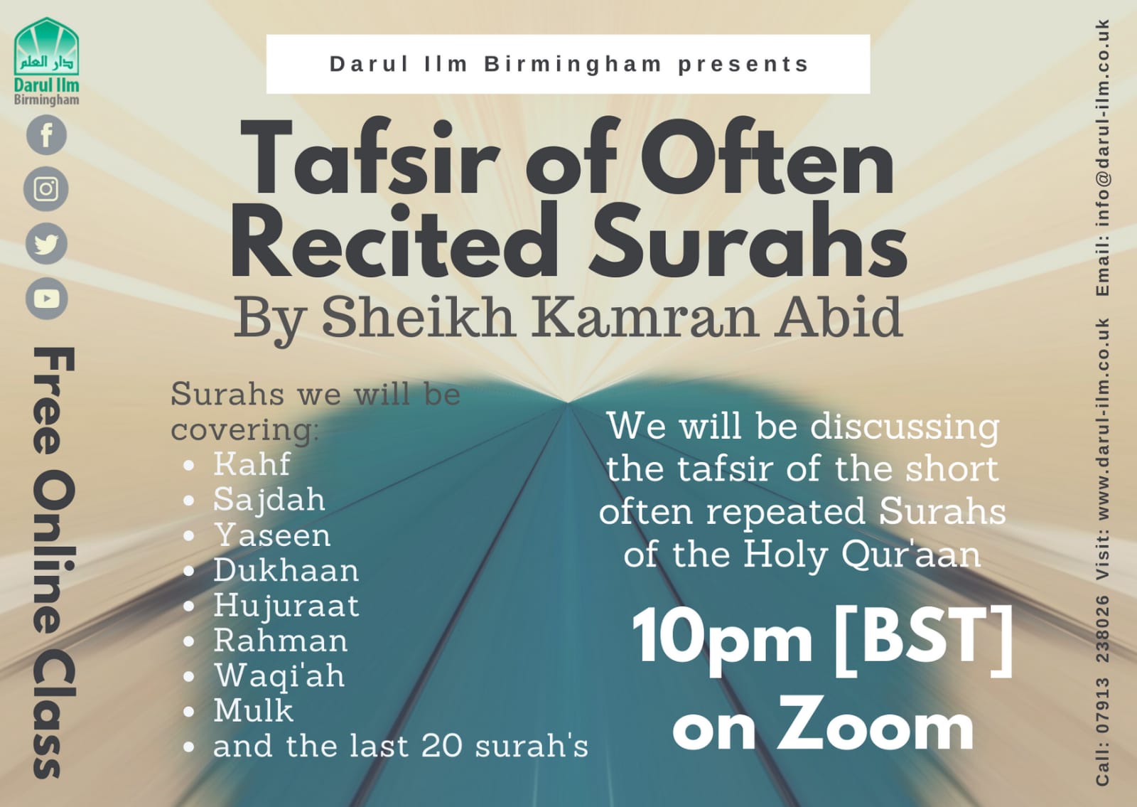 Accompany us as we delve into the Tafsir of the Surahs we read almost on a daily basis. Enlighten your minds and your connection with the Quran by unearthing the reasons for the revelation of these Surahs, the translation of the verses and invaluable lessons we can incorporate into our lives.